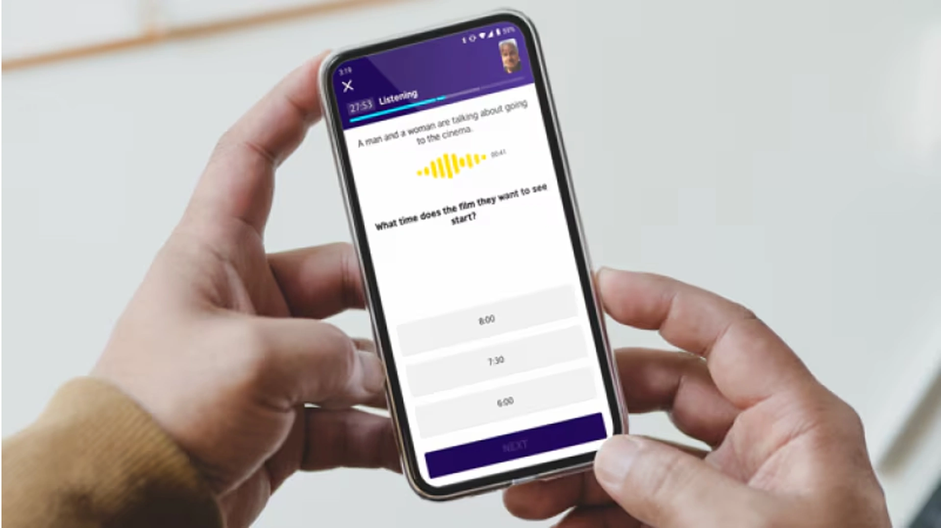 The test provides a percentage score for each of the four skills. It assesses your level between A2 (Elementary) and C1 (Advanced) on the CEFRL (Common European Framework of Reference for Languages).